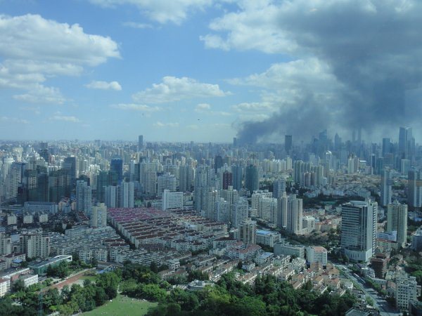 2010.09.24早上從飯店窗外看見上海天空一大片黑煙我從房間的浴室窗戶拍攝